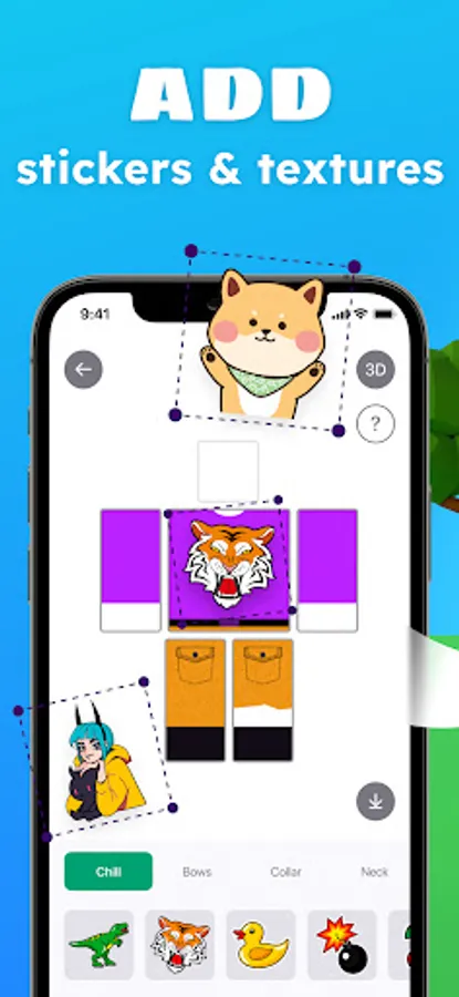 Stand out among your friends and other players! In our app shirt maker for Roblox you will find a library with both a variety of custom skins and hundreds of amazing templates options to create your own costumes, t-shirts or pants for Roblox. Choose the template you want and use the tools you need to edit the look you've created, then add cool textures and stickers to bring in even more creativity and color to your outfits. Make clothes for Roblox and turn a gray avatar into a bright and beautiful look!