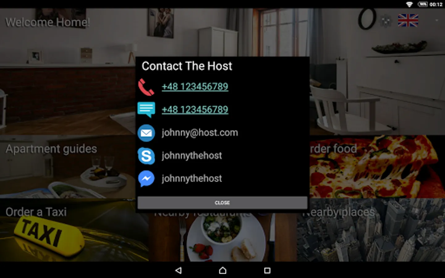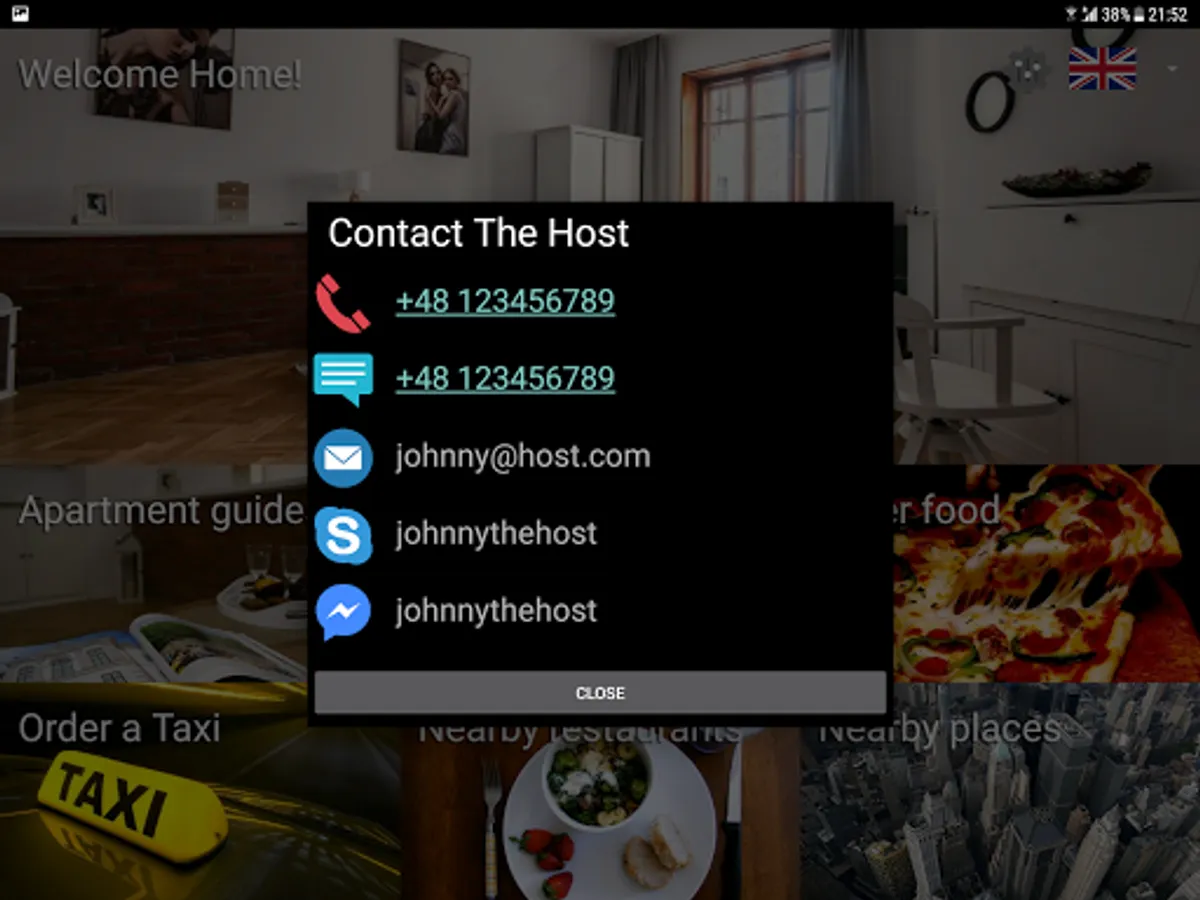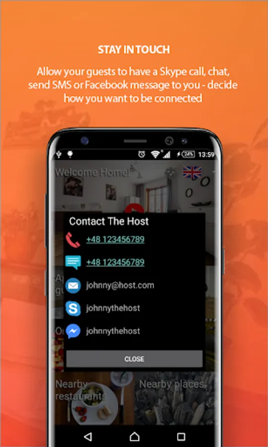 🏠 provide contact information, so that guests can call your mobile or send SMS message (if supported by the device), have a Skype video call or chat, or contact you via your favorite messaging application (Facebook messenger supported)