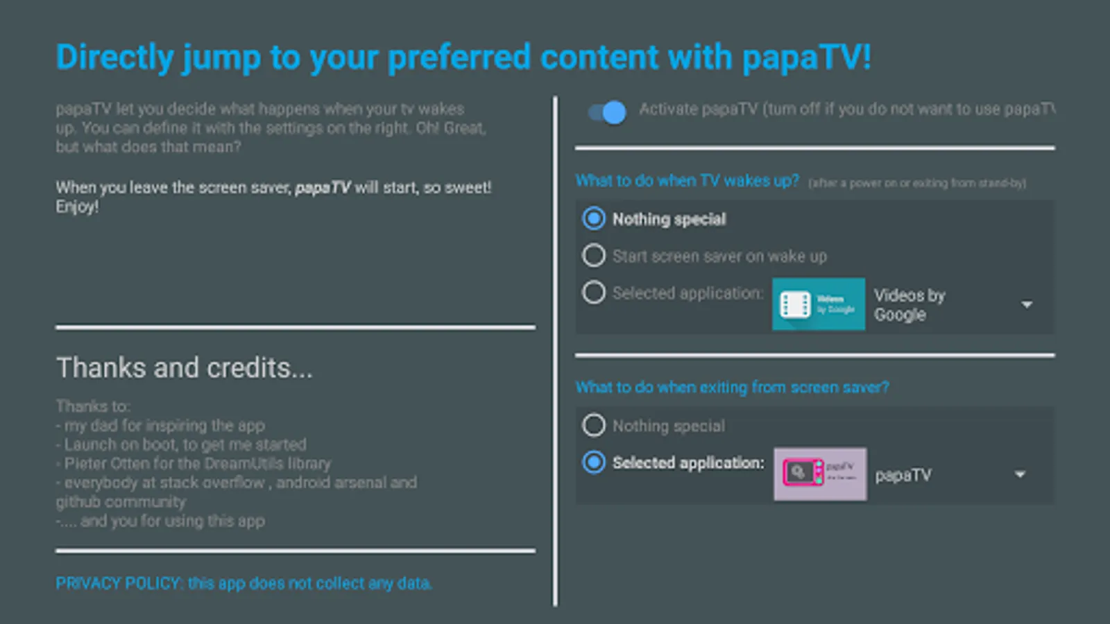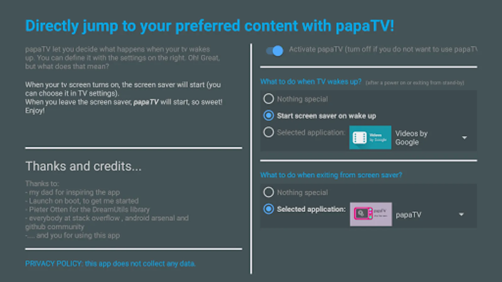 No matter what application you used last, your favorite application, or screen saver will start whenever you start using your TV.