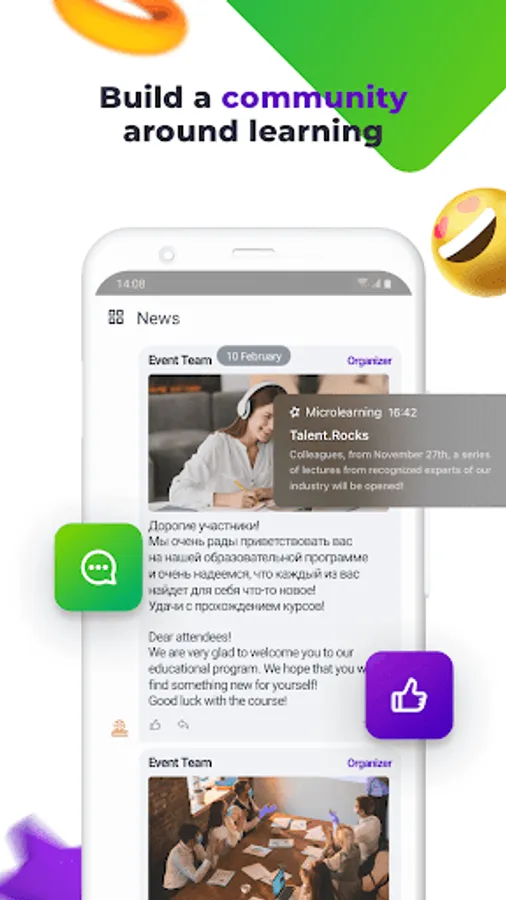• Add an internal social network with group chats and direct messaging, news feeds and photo gallery, and build a community around learning.