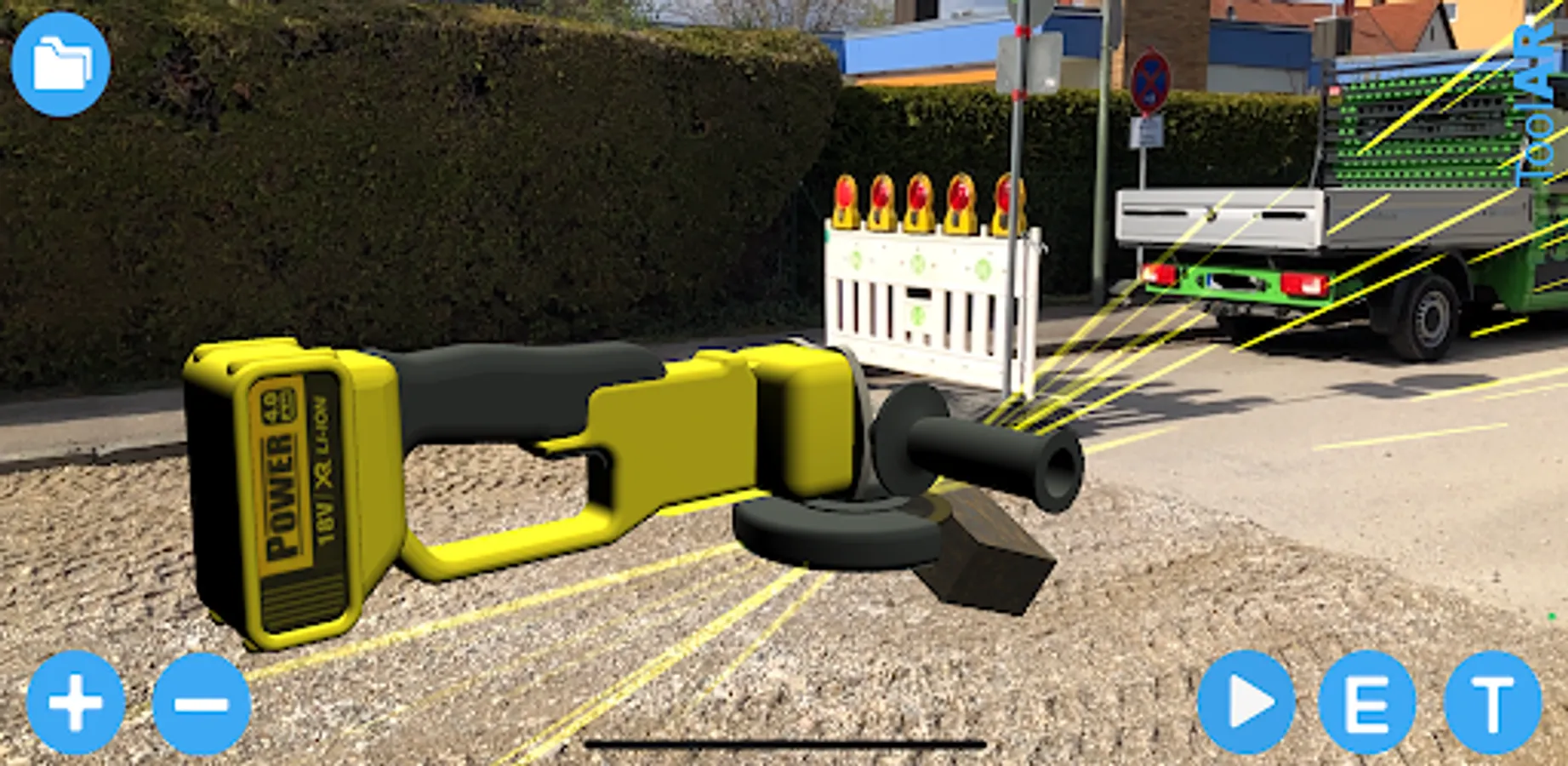 Test tools in AR. 1. Cordless drill: four different tips, view inside with exploded view; 2. Flex: Let the sparks fly