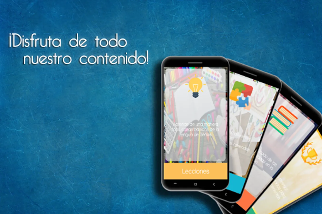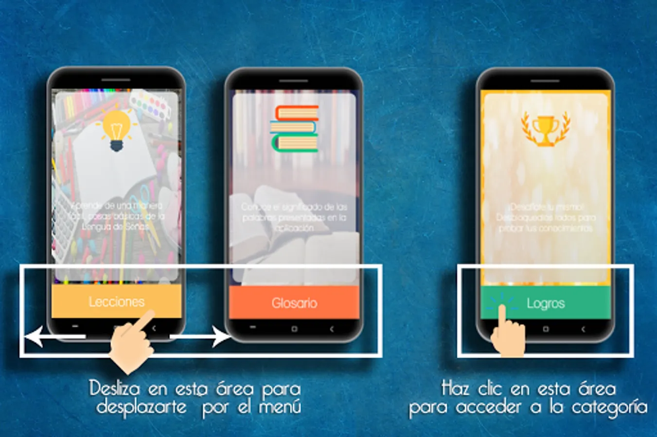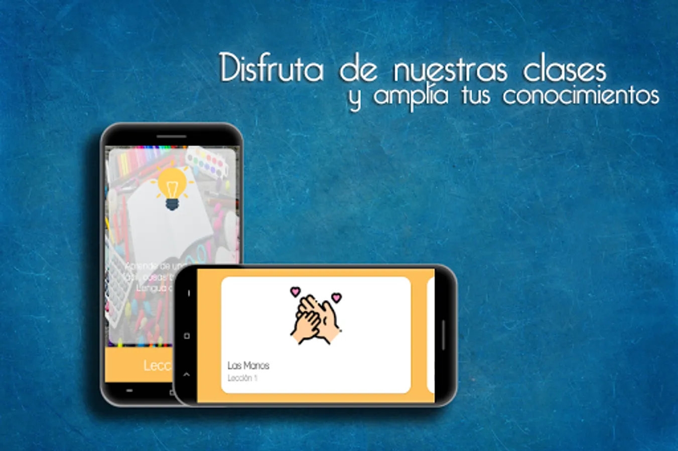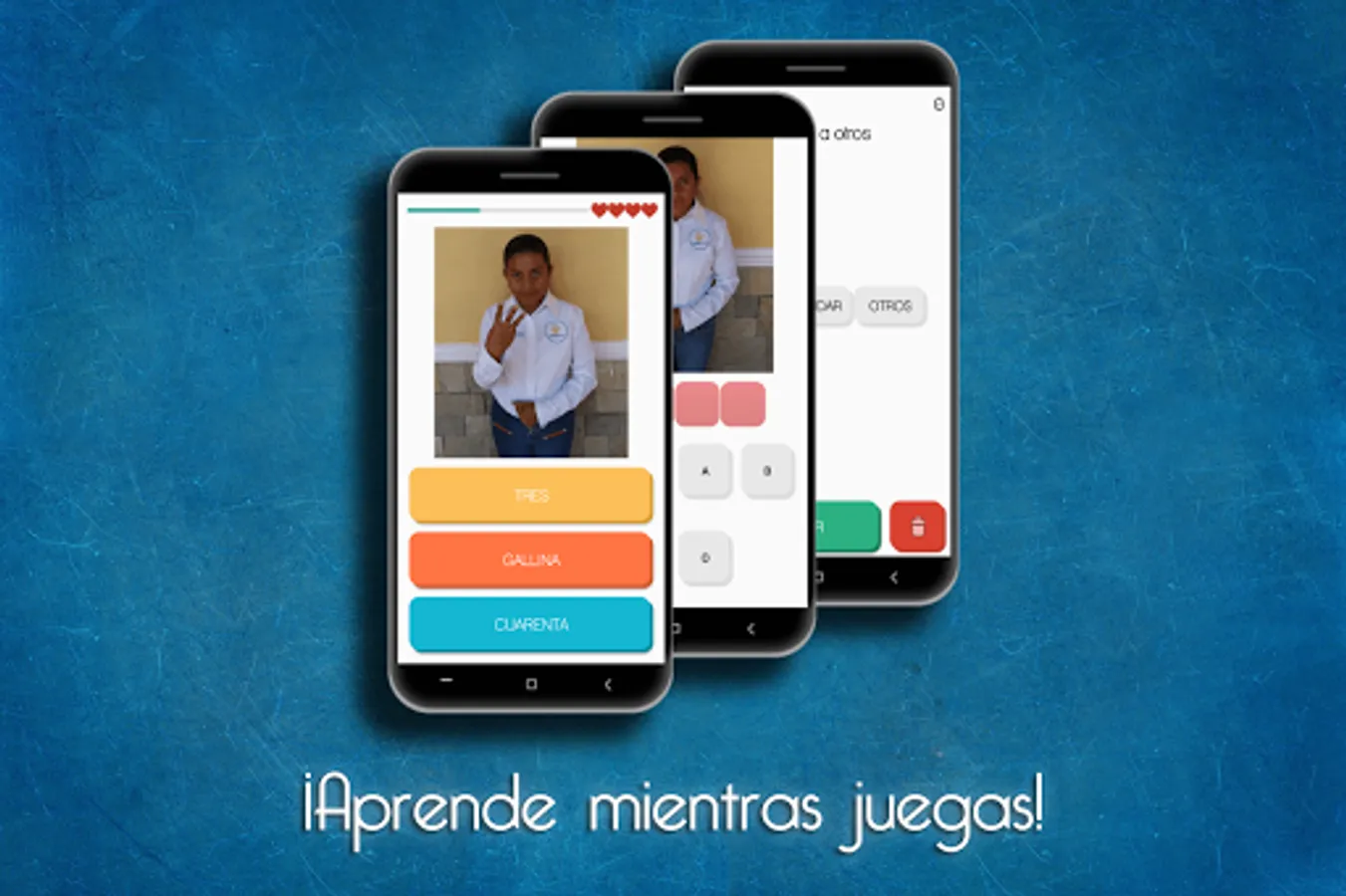 Here you will find diverse content such as: Classes that will help you learn some basics of the Mexican Sign Language, Games in which you will have fun while you learn, a Glossary where you can practice all the signs that you unlock as you progress and much more.