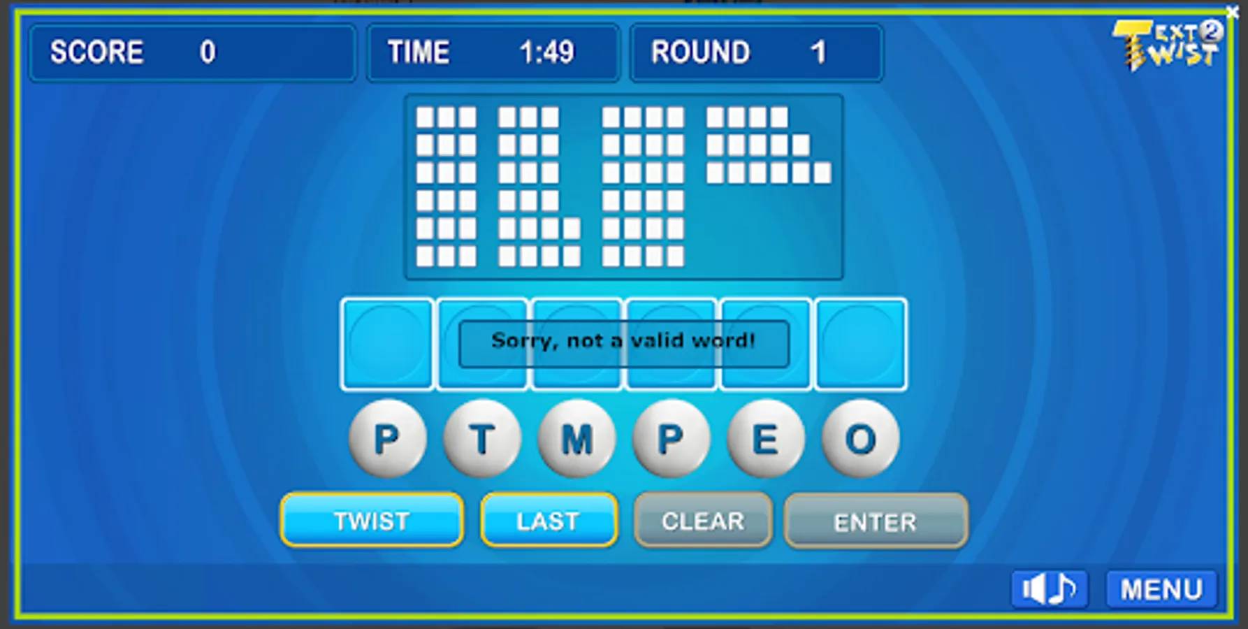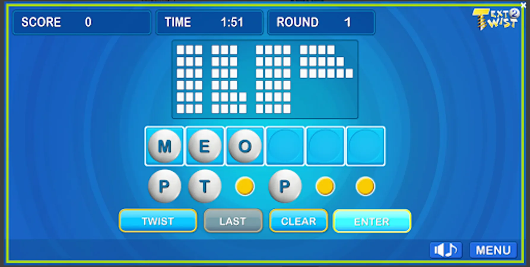 Play the second installment of the text twist series. The most important thing in this game is making as many words as you can. For example, there are letters displayed on the screen A R C T U O, the player will have to create as many words as possible among these letters. Some words might be CAR, and TOUR, etc..