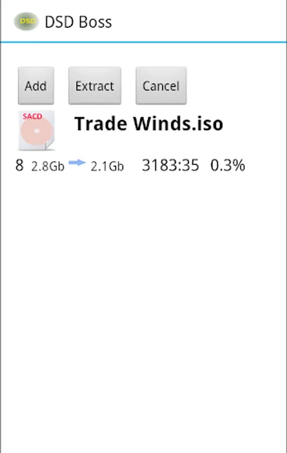 DSD Boss opens series of applications helping to manipulate with music DSD carrying format files. One of important operation is extracting and unpacking a DST encoded stereo track from a SACD image for the following playback of the result using such applications as Kamerton. On fly DST decoding requires huge computation resources which can issue a draining of a phone battery. (The problem isn't so serious for modern processors though). An extracted track is also taking less space in most cases than an original SACD image. Due high CPU consumption it is recommended to setup extraction tasks overnight when a phone is connected to an external power source. Typical extraction takes about 10 hours on 1GHz ARM processor and just about 20 minutes on an equal frequency i5. Therefore using the application is recommended only for cases when no desktop computer is available for the same task.