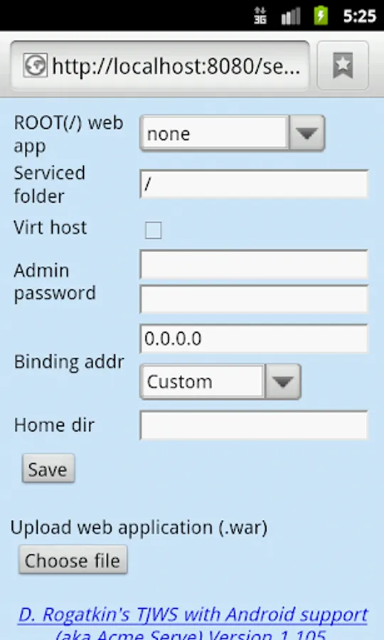 Web/application server for Android. It can deploy standardly packaged .war web application. It can also service a directory of choice as web directory. SSL is supported. Websocket is supported.
