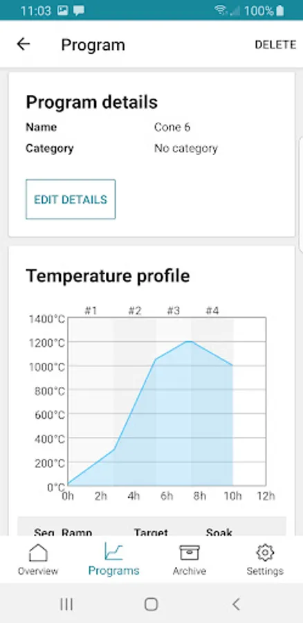 With your ROHDE myKiln app, you can manage one or more kilns and you can have the most important parameters of your firing kiln live on your smartphone or tablet. In addition to the status, you can also see the current segment, temperature and duration of your firing and get a graphical firing curve of your target and actual values.