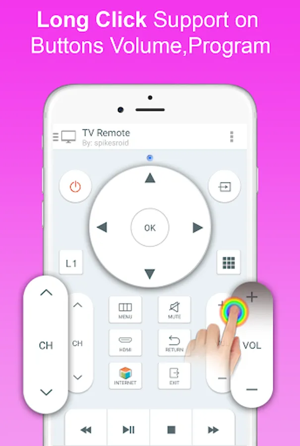 ✓ Long click on buttons is supported (volume, program, left, right, up, down)