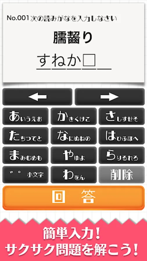 ゲームは簡単、各階級ごとに50問1セットにまとめられており、ランダムで漢字が出題されるので、そのよみがなをひらがなで入力していきましょう。