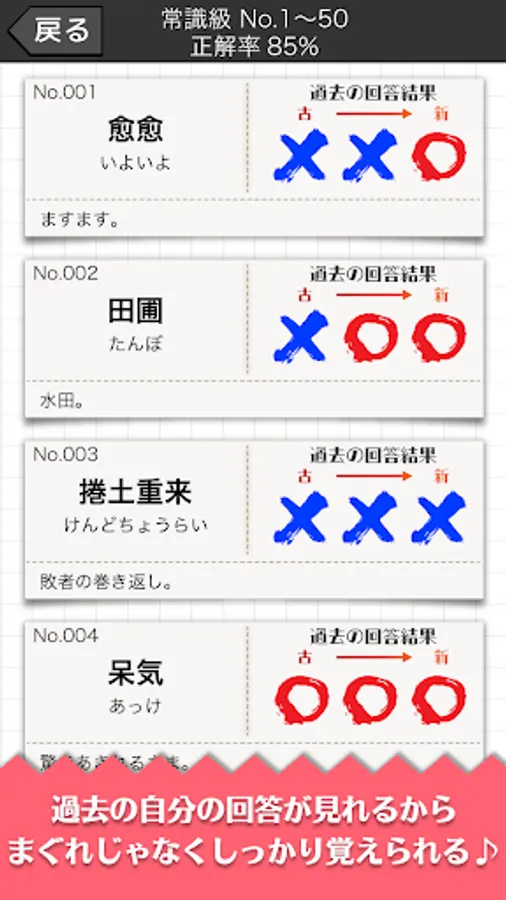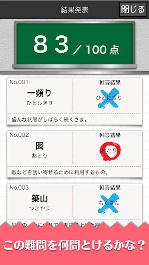 また漢字リストや回答結果に、その漢字の意味を追加したため、漢字をただ覚えるだけでなく、言葉の意味も一緒に勉強できるようになりましたので、さらに記憶に残りやすくなりました。