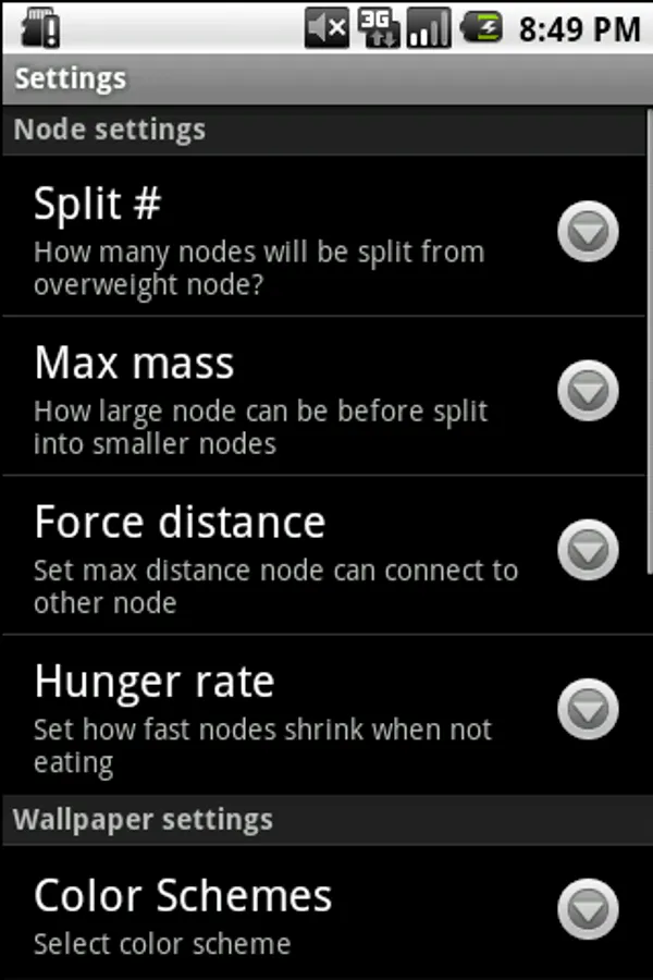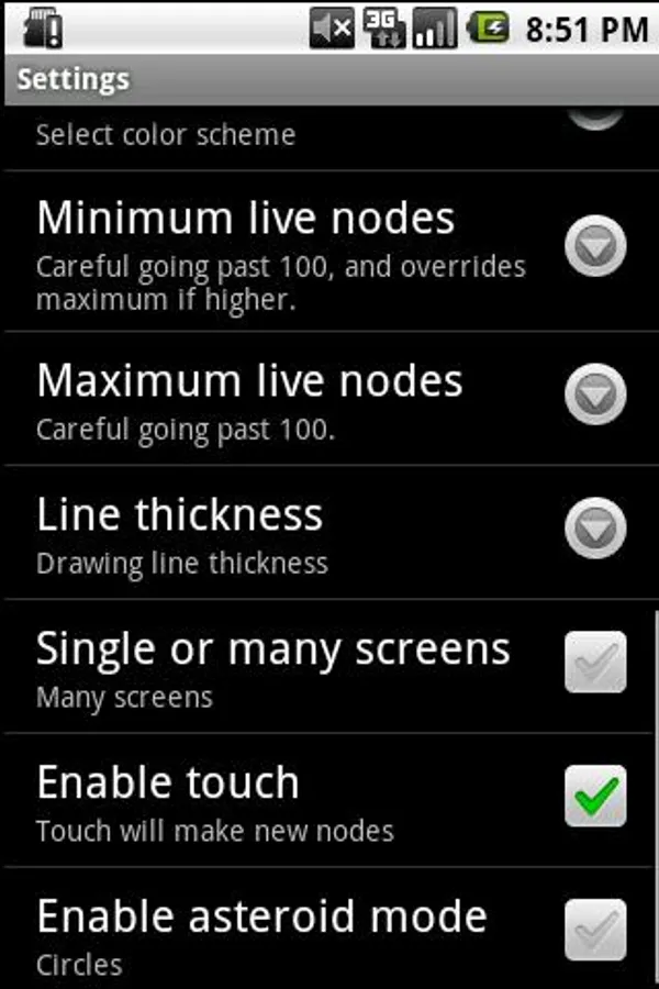 This live wallpaper is designed for people who want live wallpaper while keeping it as black as possible in order to save power on Super AMOLED screens. Cpu power usage with this live wallpaper is small as long as you keep minimum or maximum live nodes to lower levels around 50 or so.