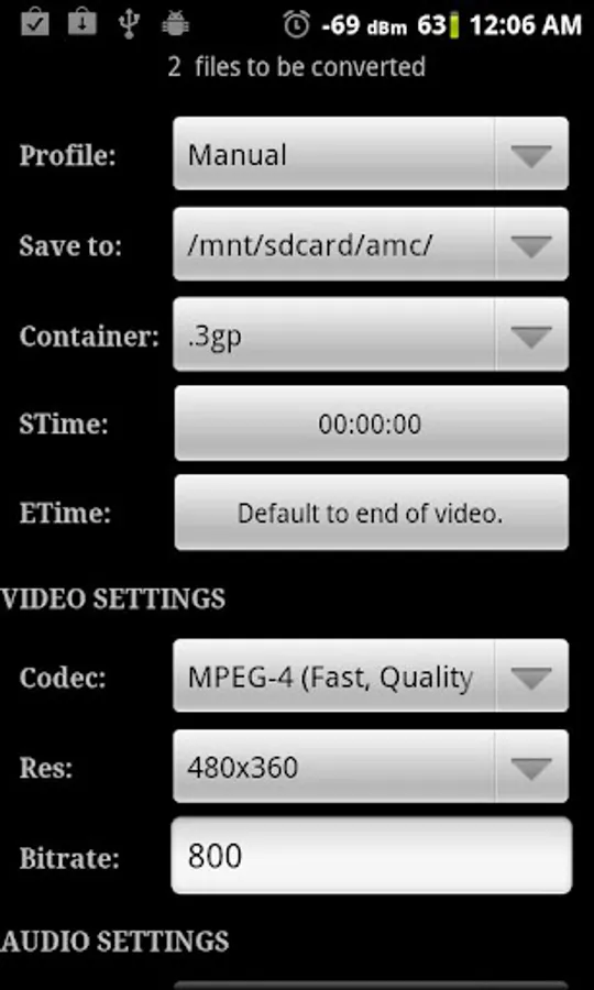 -advanced mode to specify video bitrate, arbitrary resolution, audio bitrate, codec etc. (Manual profile)