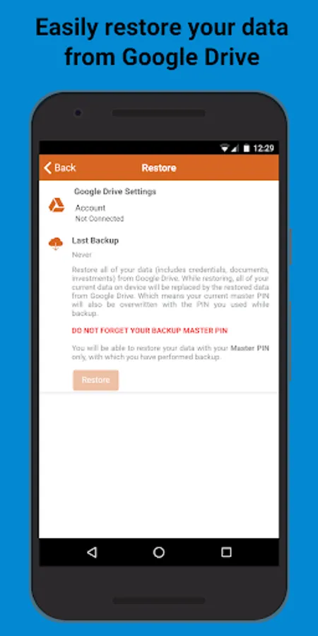 All your personal information is saved on your phone or your personal Google Drive account with strong encryption algorithm. Nobody but you can access your account.
