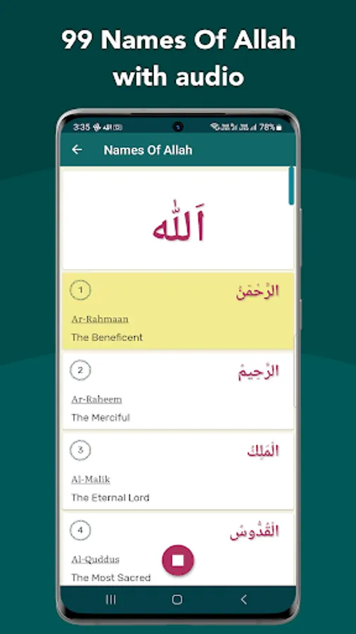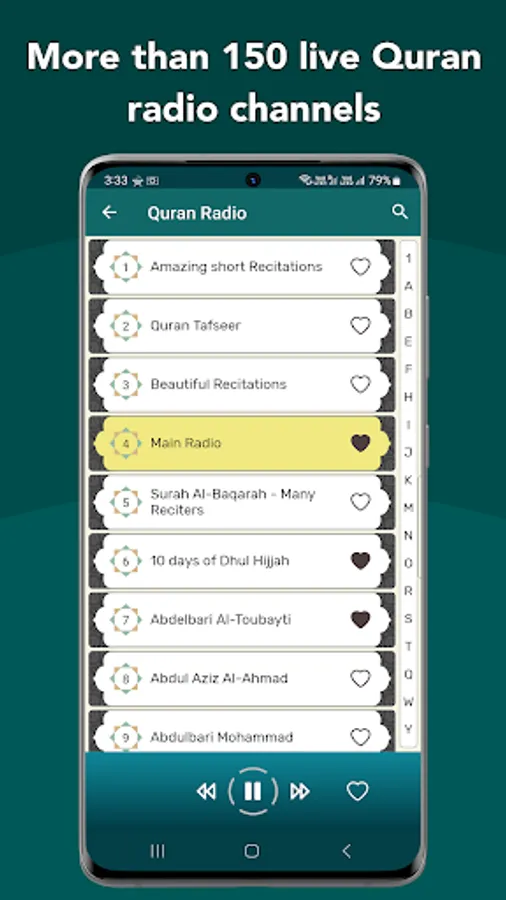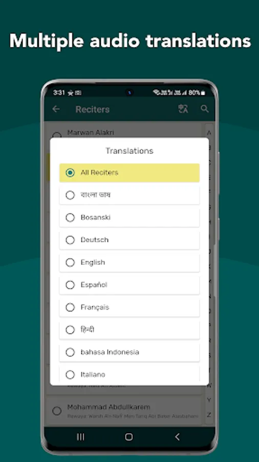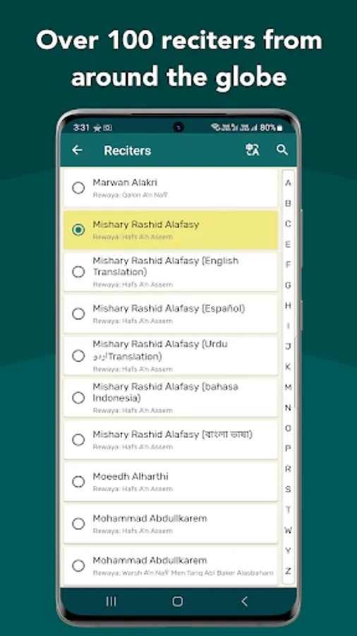 - Quran recitation by famous reciters like Mishary Rashid Alafasy, Abdul Rahman Al-Sudais, Saad Al-Ghamdi, Ali Abdur-Rahman al-Huthaify, Qari Syed Sadaqat Ali, Ahmad Bin Ali Ajmi, Qari Waheed Zafar Qasmi, Abdullah Basfar