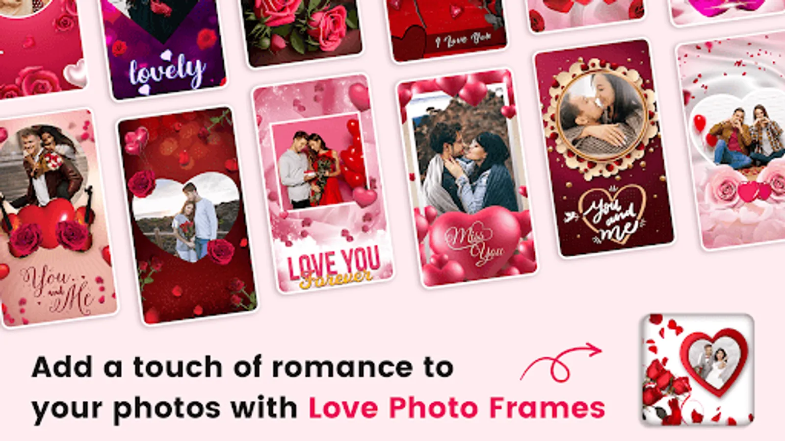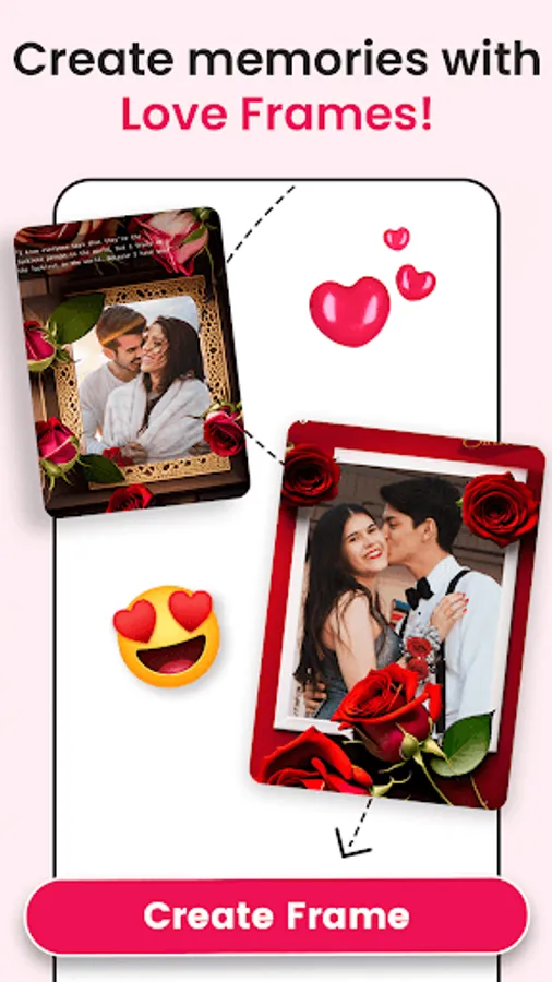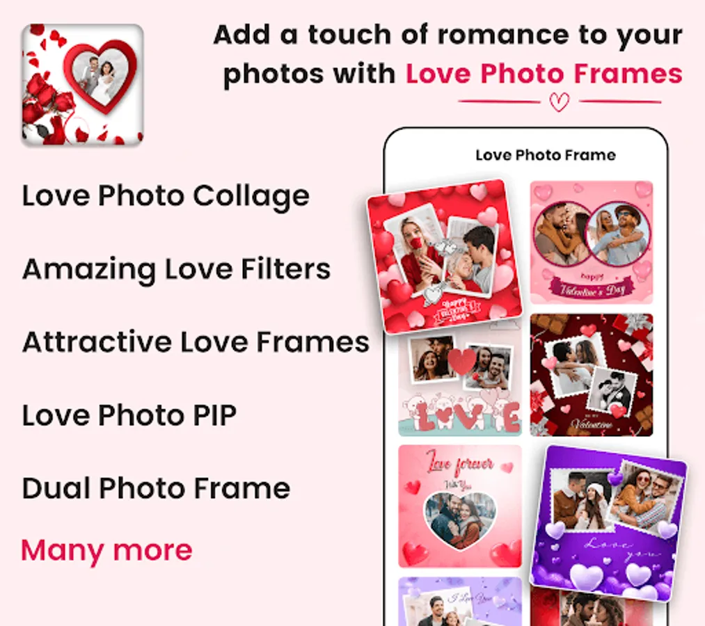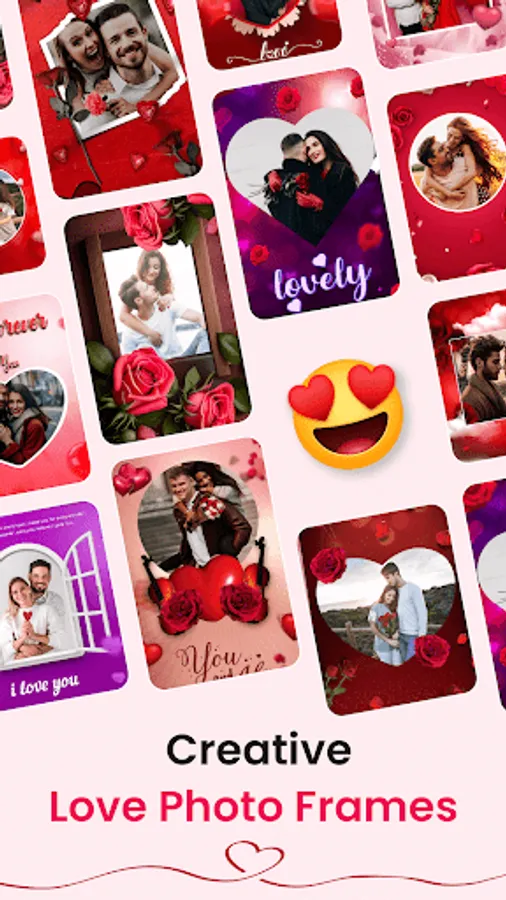 Love photo frames editor contains templates, text with fun fonts, love photo effects, backgrounds, stickers, grid and layout options, emojis and exciting love photo editor tools to make your photos become extra special and really beautiful love photos. You can spice up your photos using love stickers, or make them look creative with effects using love photo frames!