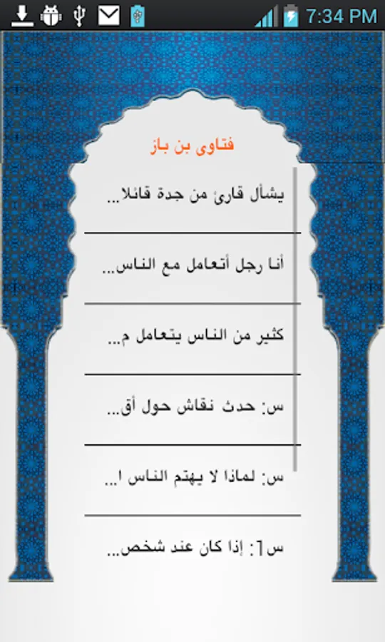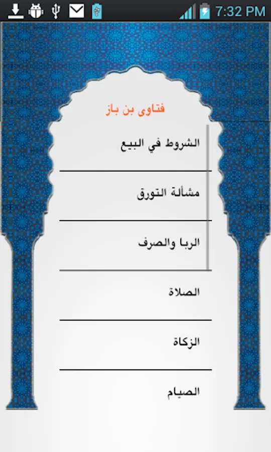 دليل الفتاوى هذا مبني على "فتاوى بن باز". من هو عالم عظيم ، بسبب جهده الكبير تعلمنا شيئًا ما ونحن قادرون على عمل برامج اليوم ، هذا التطبيق يتكون من المحتويات التالية
