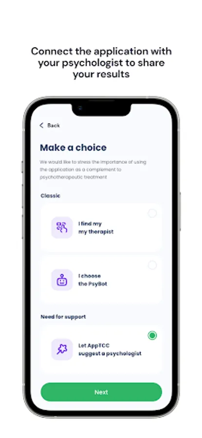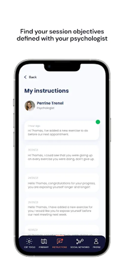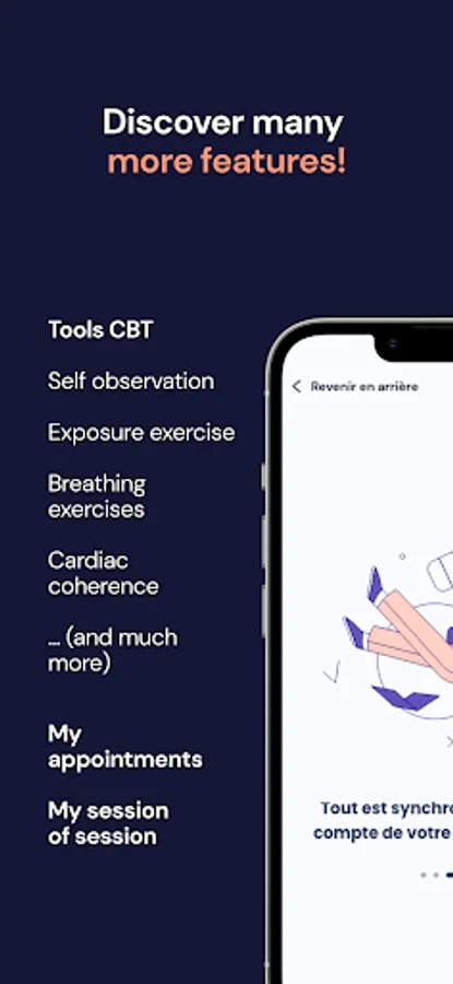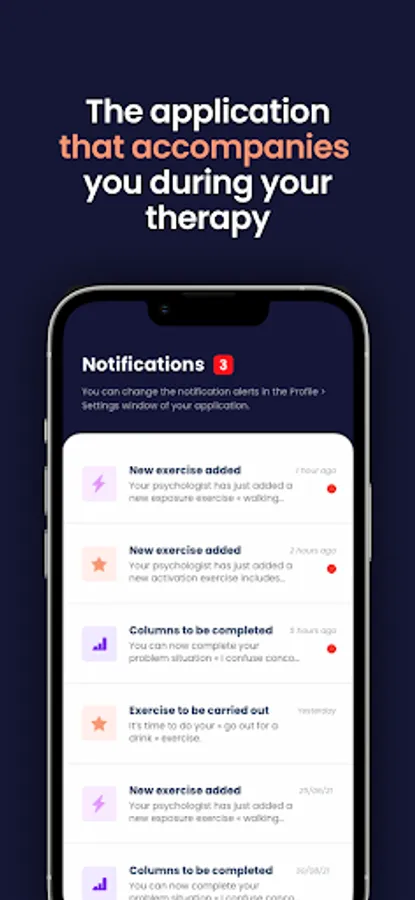 AppCBT is the first mobile application that accompanies the patient during his or her behavioral and cognitive therapy and facilitates follow-up with the therapist.