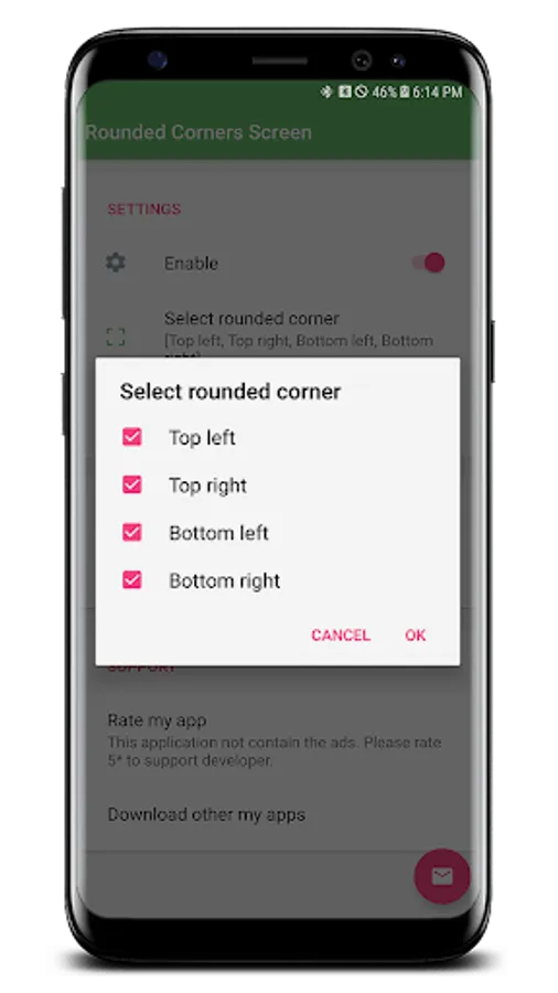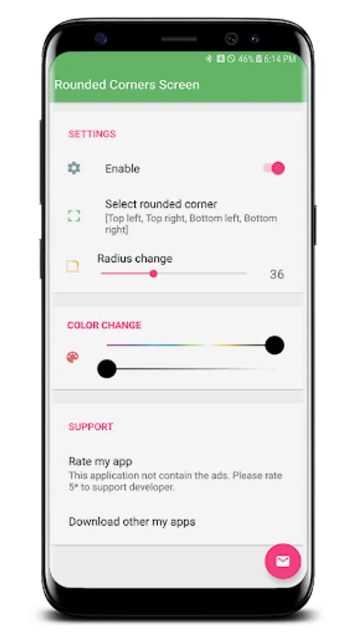 Rounded Corners Screen is simple app have settings which allow you adjusting the corners radius easy same with LG G6, Samsung Galaxy S8, Samsung Galaxy S9, Samsung Galaxy S10, Samsung Galaxy S20, Samsung Galaxy Note 8, Galaxy Note 9, Galaxy Note 10, Galaxy Note 20...