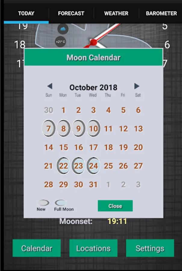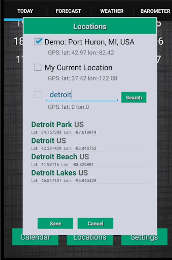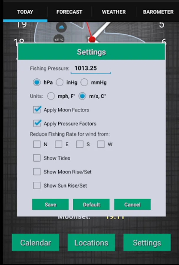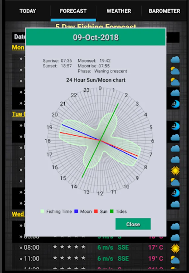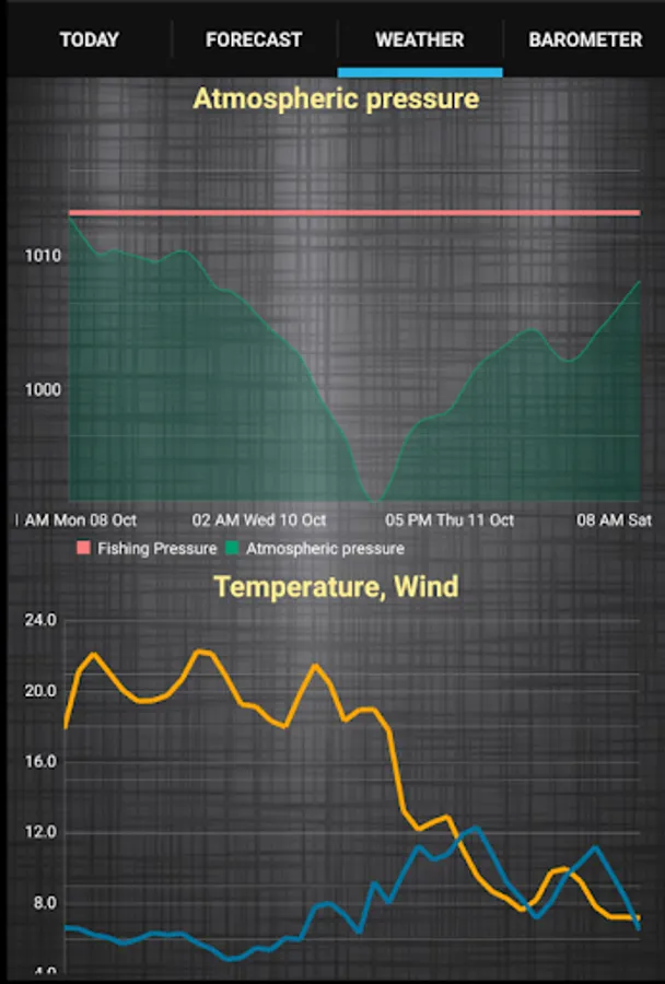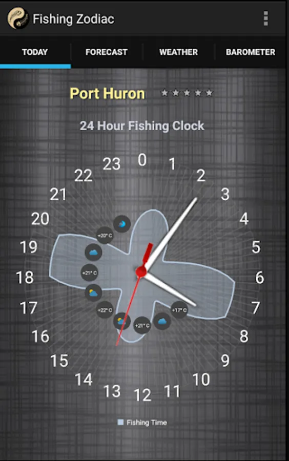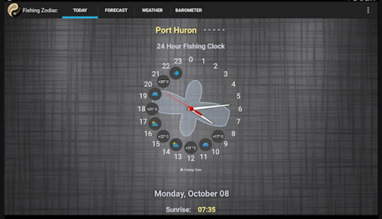 You will have a fishing forecast with the best time for fishing based on the sun/moon phases and the barometrical pressure.