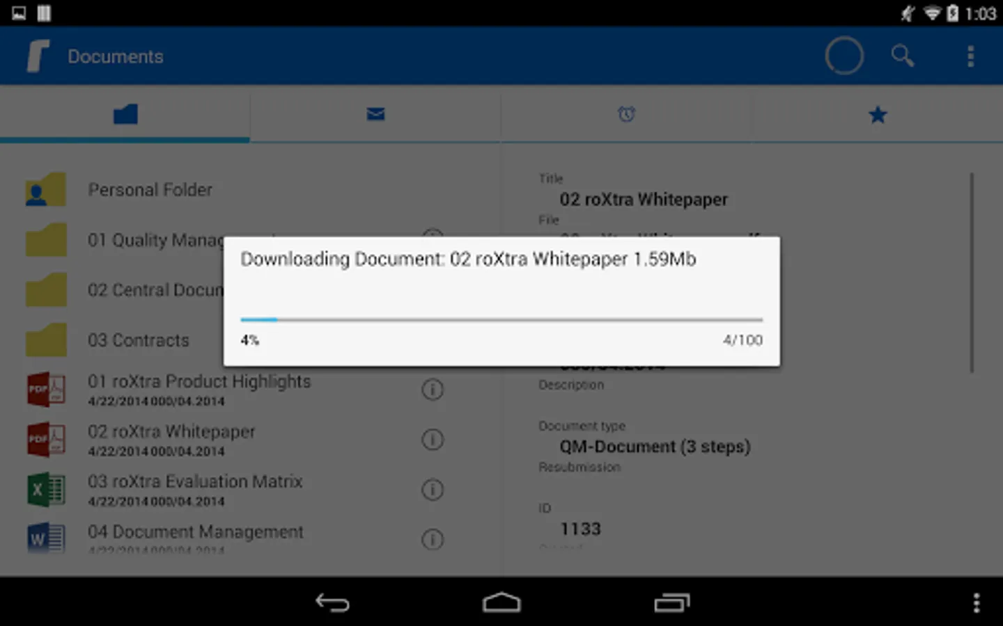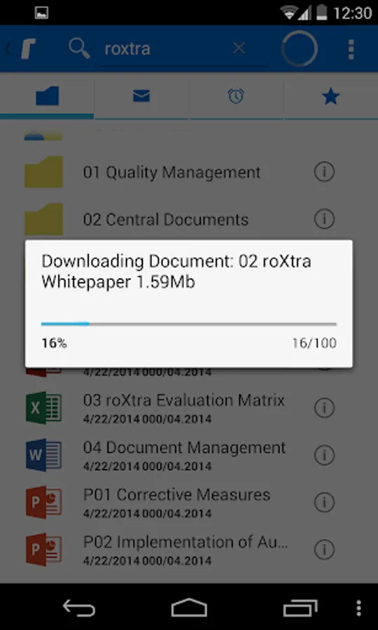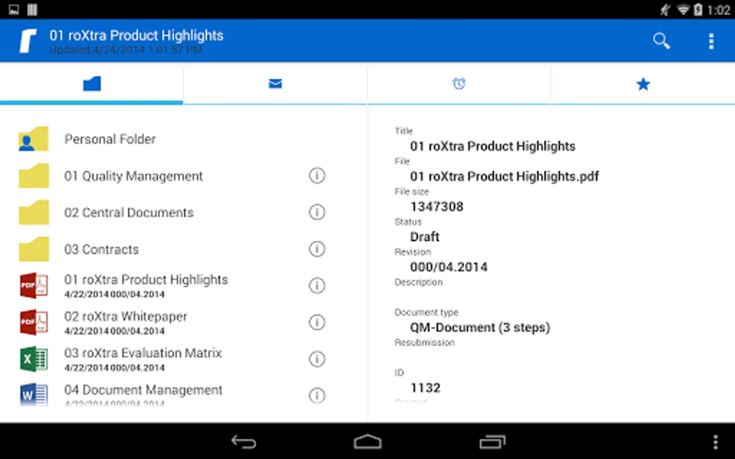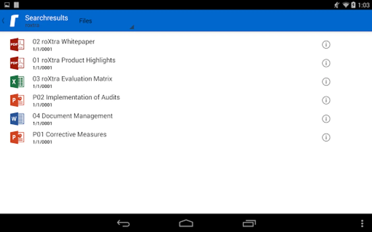 With the roXtra app you have mobile access to your roXtra system and become even more flexible in terms of your document management. You can easily access all documents directly from your mobile device and see all the stored details about documents and folders - during business trips, on the train or at a customer site. With the roXtra app, you can also manage your tasks and confirm roXtra reading tasks while on the go. You are always up to date and with the integrated search and your Favorites you always have the fastest possible access to all important documents in roXtra.