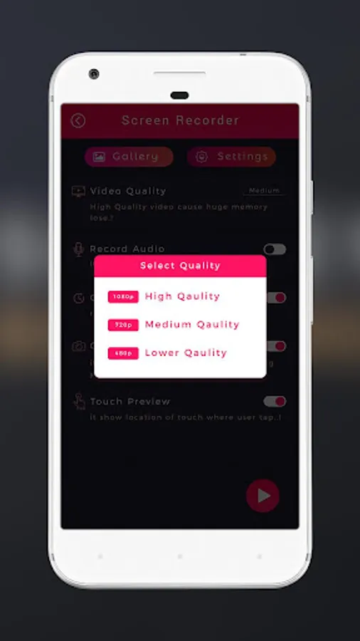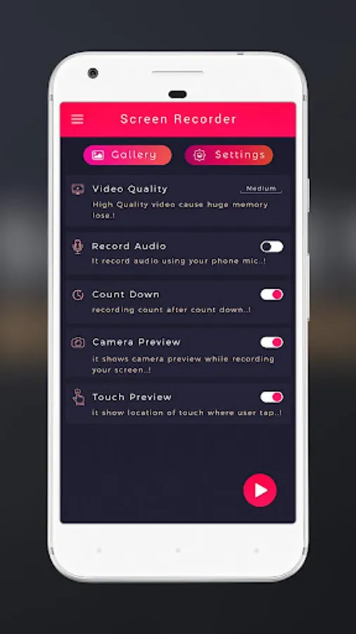In the settings, you can enable screen touches so the user who are watching your videos will know exactly what you are doing. And moreover, there are many other features in this Full Screen Recorder HD app such as managing video resolution quality, touch preview, rename file name, screen view, count down, view/share or delete your recorded videos...User can directly send videos via social apps to their loved ones & friends. All of them are free for you! Have fun.