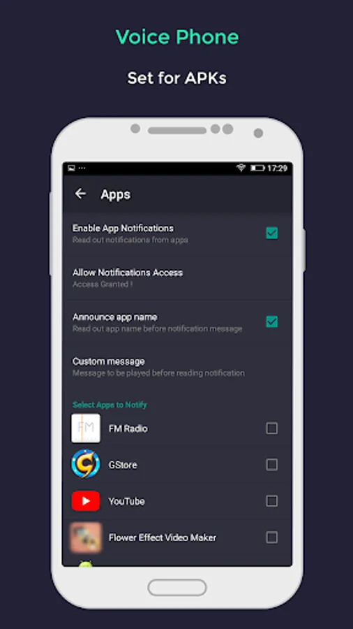 Apps:Hear notifications posted by apps. You can select the apps which you want to hear.