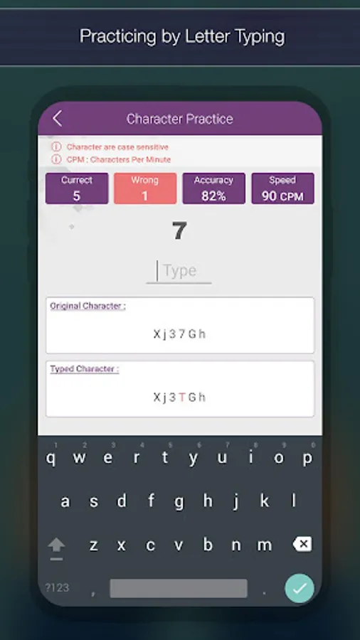 Enter one character at a time to learn to type. Find the statistics (CPM - Characters Per Minute) of the typed character.