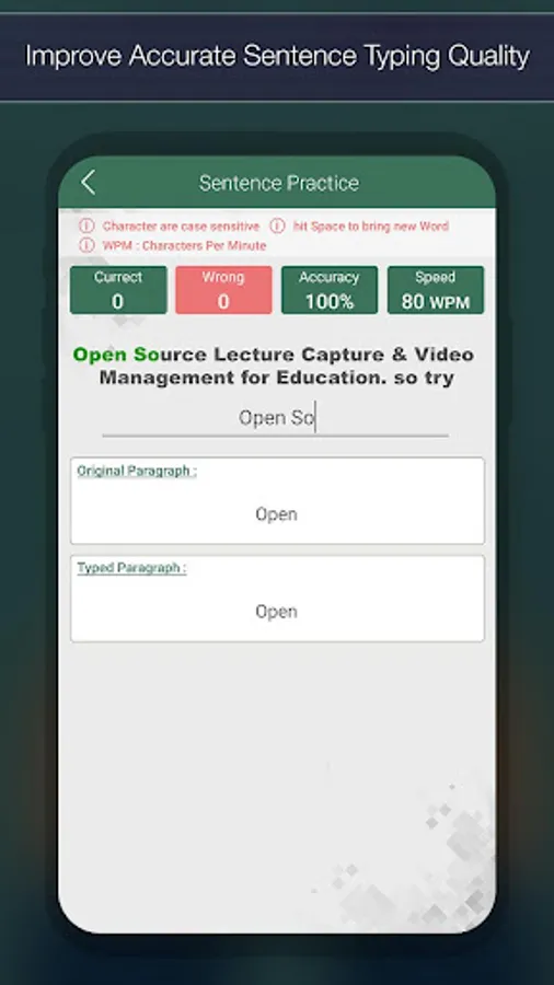 After using this application you will increase your typing speed. Improve typing by practicing the sentence, before appearing for typing challenge.