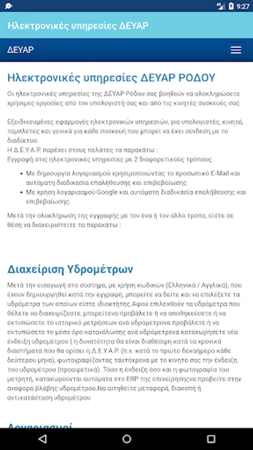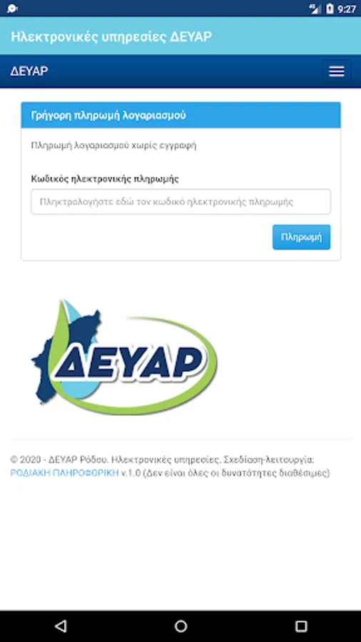 Pay your bill or settlement easily and quickly using the online services of DEYAR Rhodes. Get a secure account so you can manage all your connections to the DEYAR network. View the tab for each login, print or save each bill issued. Coming soon with many useful new features.