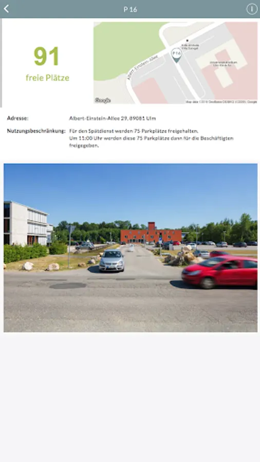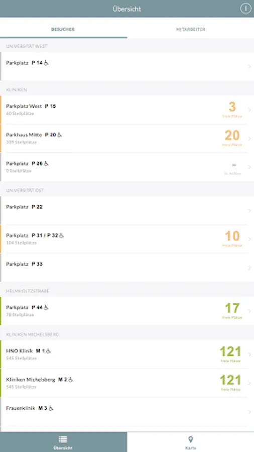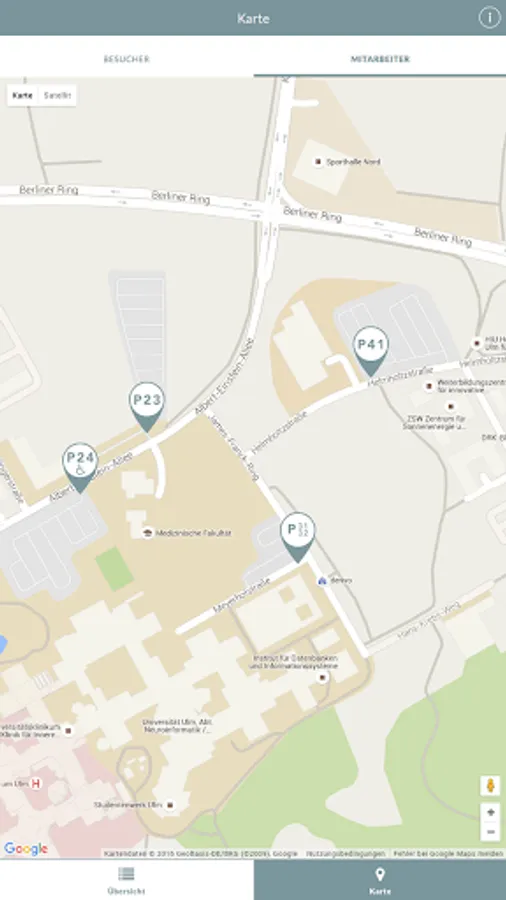 The parking for patients, visitors, students and staff at the Ulm University campus area is clearly depicted. The connection to the DUU Parkleitsystem the number of free parking spaces is displayed. Furthermore you can find detailed information such as opening times and price information to the respective parking lots.