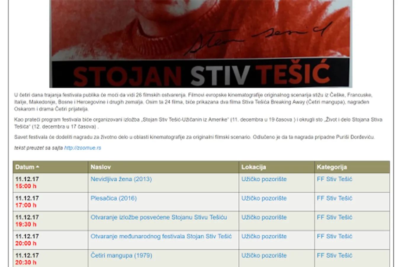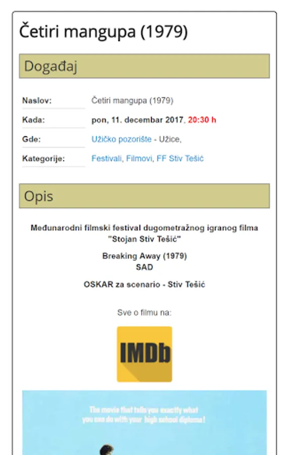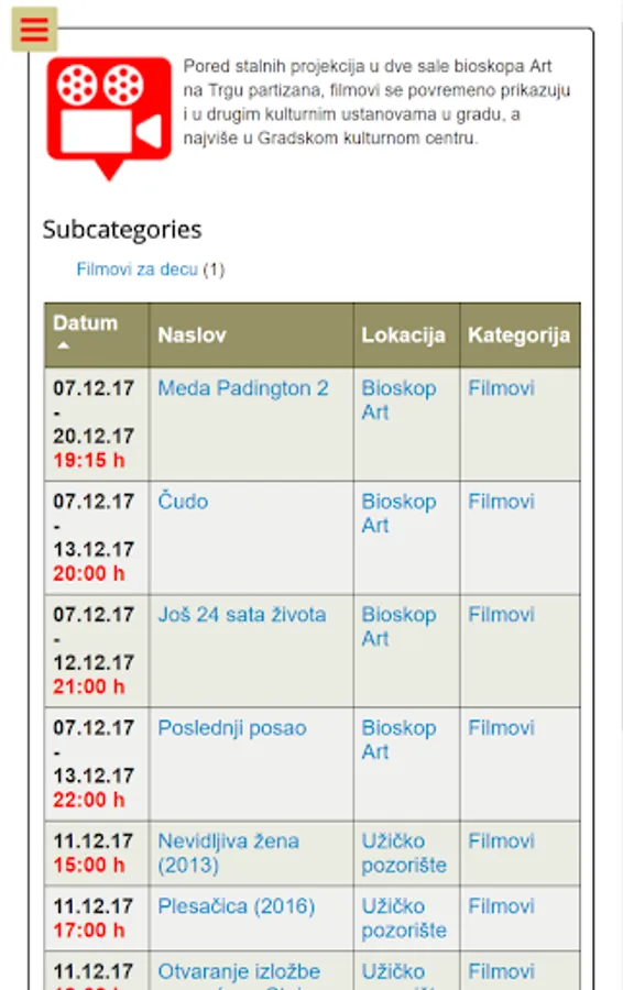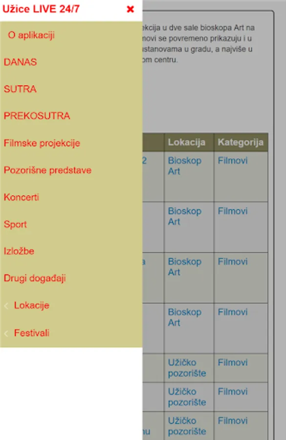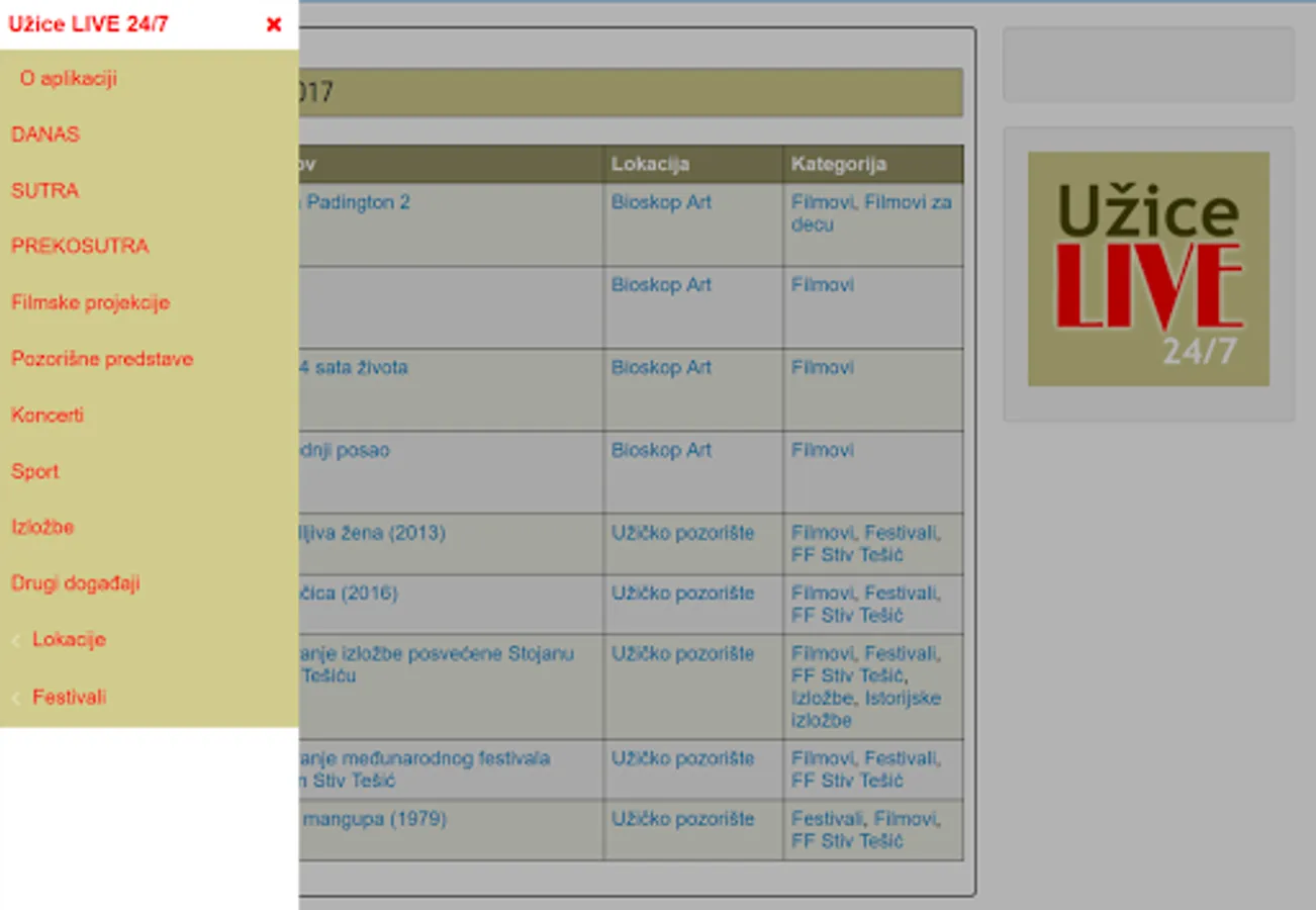 Using this application you will be on time to meet with all future events in Uzice. All lovers of film, theater, any kind of music or sport simply must have this application.