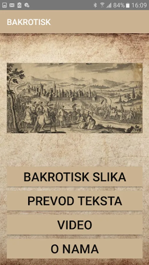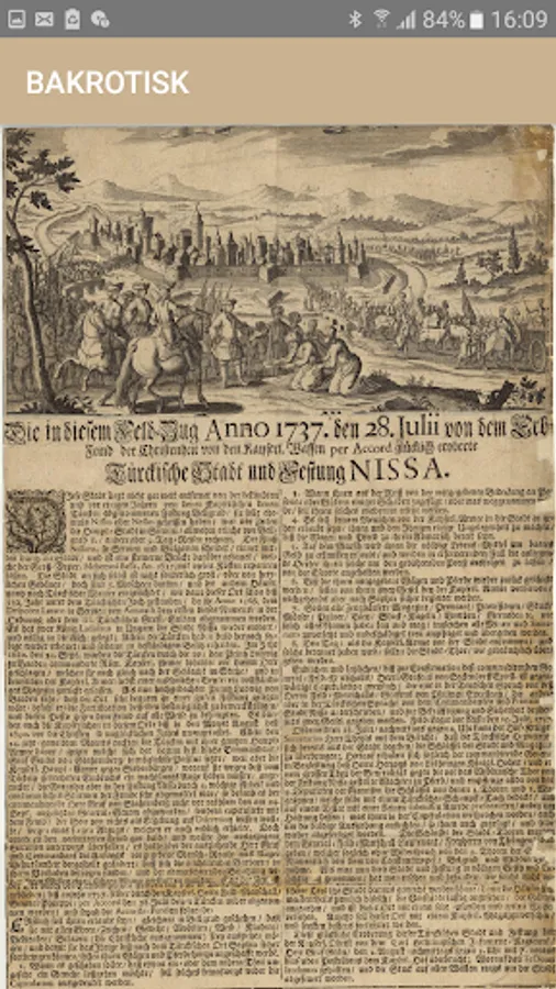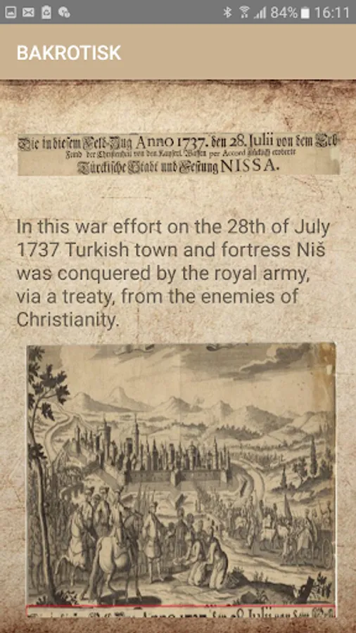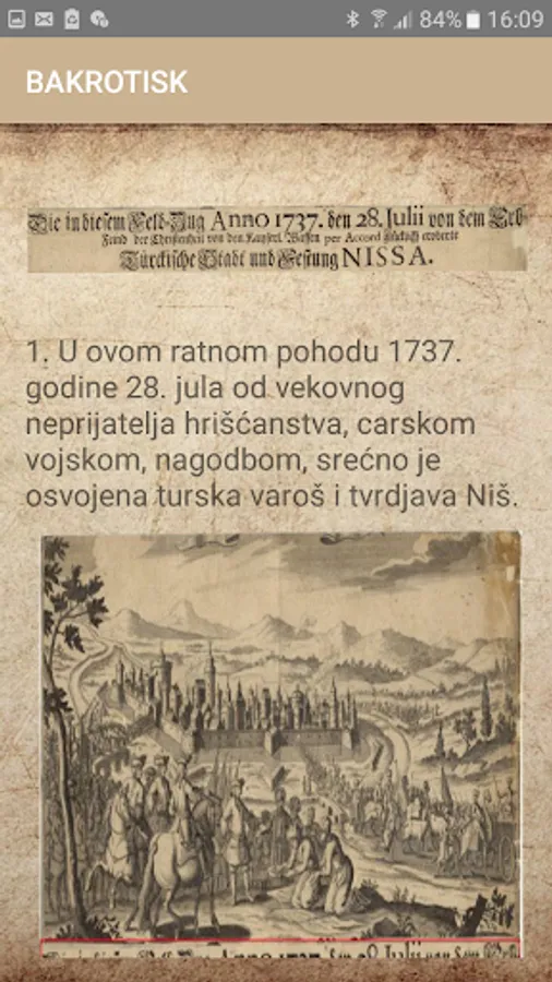 Ova aplikacija predstavlja multimedijanu prezentaciju o najstarijem dokumentu Istorijskog arhiva u Nišu - Bakrotisk o predaji ključeva grada Niša Austrijancima 1737. godine. Aplikacija sadrži skenirani dokument kao i prevod teksta koji je pisan goticom.