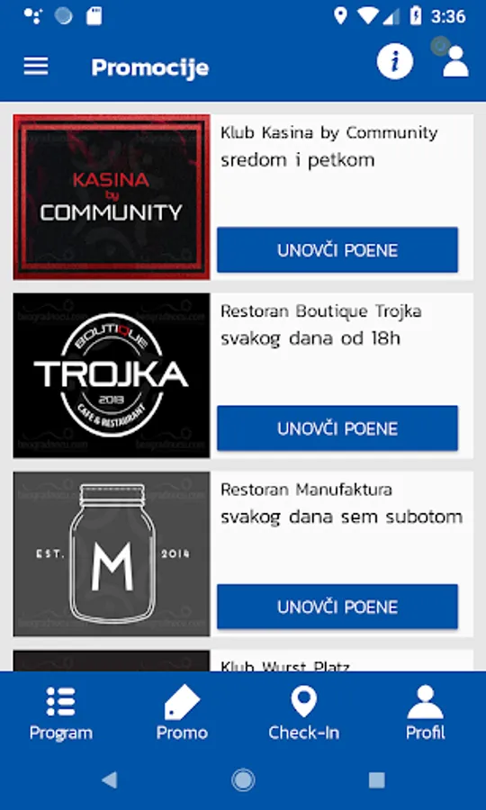 The application also offers a unique loyalty program so that various activities in the application (check-in, reservations, friends invitation ...) get points that can be changed afterwards for various benefits in the premises and partner companies (bottles of drinks, entrance via order, taxi ...)