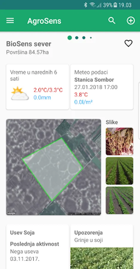 The digital platform AgroSens provides support to farmers in monitoring the growth of crops and planning agricultural activities. It was developed by the Institute Biosense from Novi Sad and represents an important step in the digitization of Serbian agriculture and increasing the efficiency and competitiveness of domestic producers. It consists of AgroSens Web applications available on www.agrosens.rs AgroSens and Android applications.
