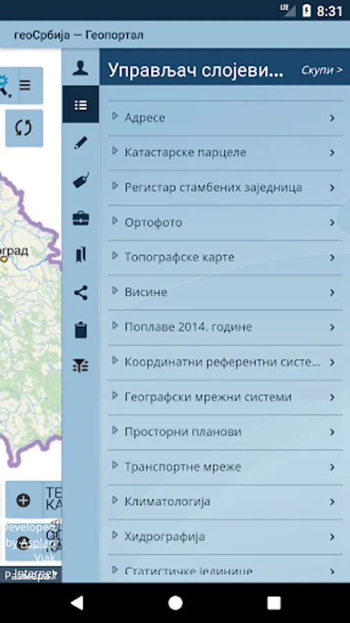 The portal can be found Geosrbija all spatial data RGA, the Republic Institute for Statistics, the Hydrometeorological Institute, data on land, buildings, addresses, protected areas, national parks, altitude and the like.