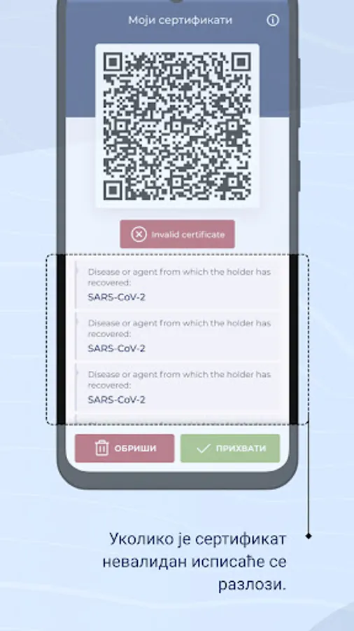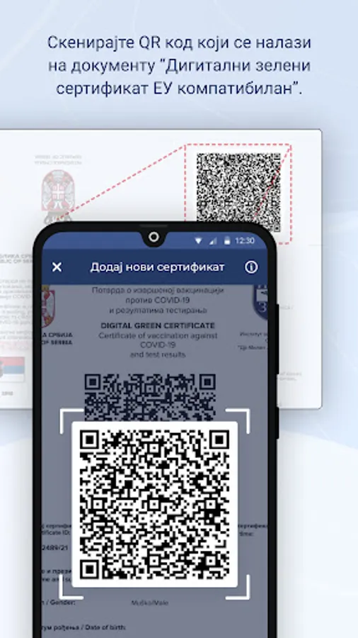 Users can download certificates via the eGovernment Portal. When they receive the certificates by email, they need to activate the My EU CBS application and click on the Add Certificate option. When the camera is activated on the phone or tablet, it is necessary to read the QR code that is on the certificate (point the camera at the part of the certificate that contains the QR code). After the certificate is read, they need to press the Accept key to save it on their device.