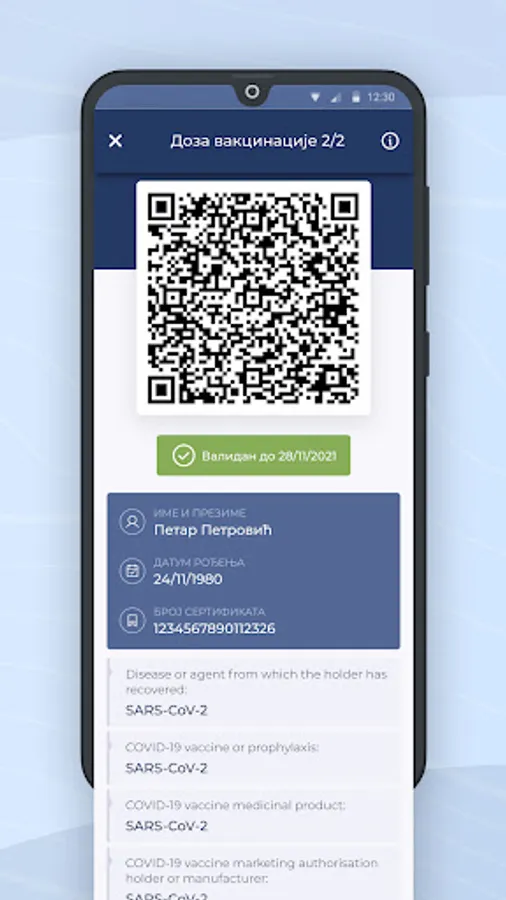 After scanning the QR code only the status of the certificate, name and date of birth are displayed.