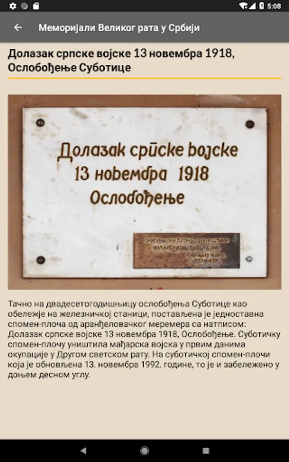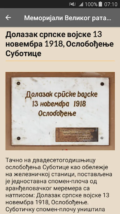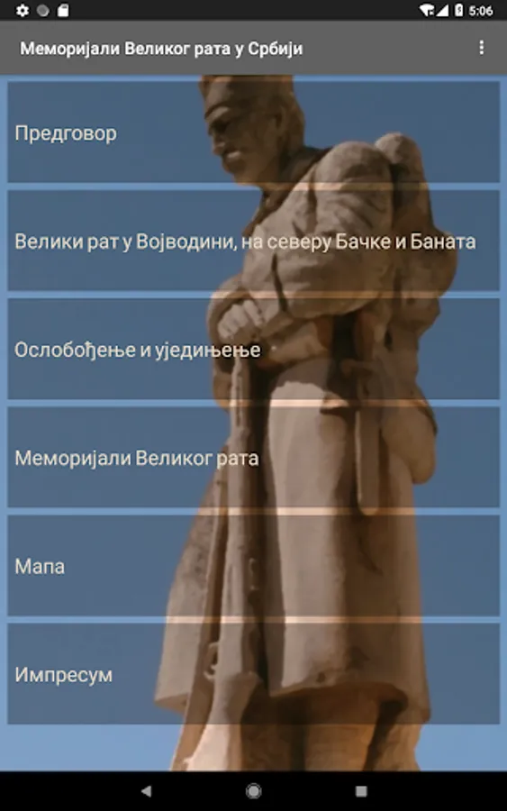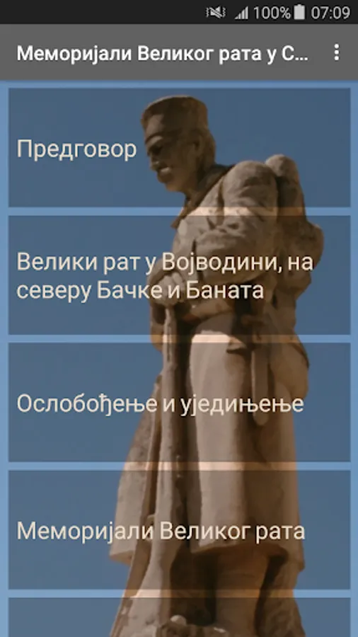 The application was created for the occasion of marking the centennial since the beginning of the First World War in Serbia, also known as the Great War, which lasted from 1914 to 1918. Although the application does not contain information about a large number of monuments, they represent a true testimony of the culture of remembering people and events that changed the world during the second decade of the 20th century, as well as ideas that reached the peak during the war, and how they came to realization right after the ward ended.
