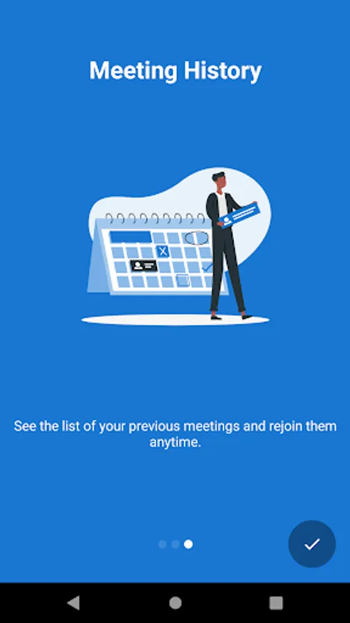 Instant video conferences with your family, friends, and colleagues. A meeting gets created when the first participant joins and is automatically ended when the last one leaves. If someone joins the meeting with the same meeting code again, a brand new meeting is created with the same name and there is no connection to any previous meeting that might have been held with the same name.