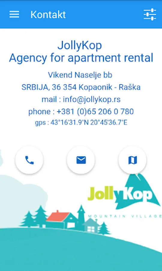 The apartment complex "JollyKop Mountain Village" is located in weekend settlement of Treska 3.8 km from the nearest ski lift (Suncana Dolina) and 6 km from the center of Kopaonik, on the main road Kopaonik - Raska at an altitude of 1350 m.
