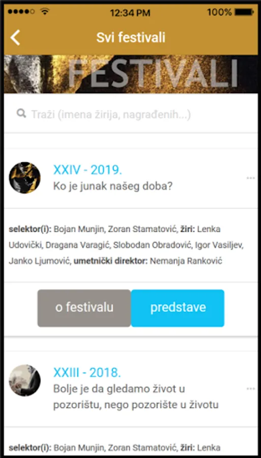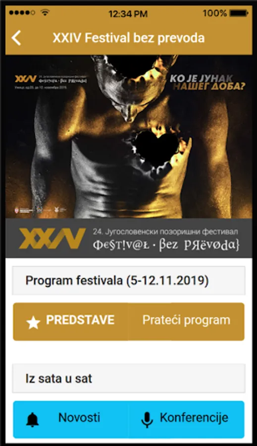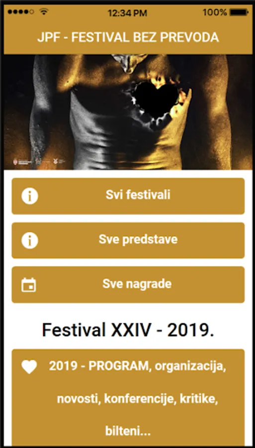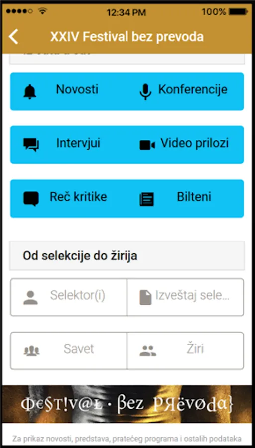 The Festival WITHOUT TRANSLATION is a review of the best theatrical performances from the territory of the former Yugoslavia, which is being held for the 24th time this year. It lasts 8 days and is competitive in nature. This application covers data on all 24 festivals (from organizers to participants). It has the ability to search data by many categories, and for users who are online and during the program, it allows to see all hundreds of media records from the festival.