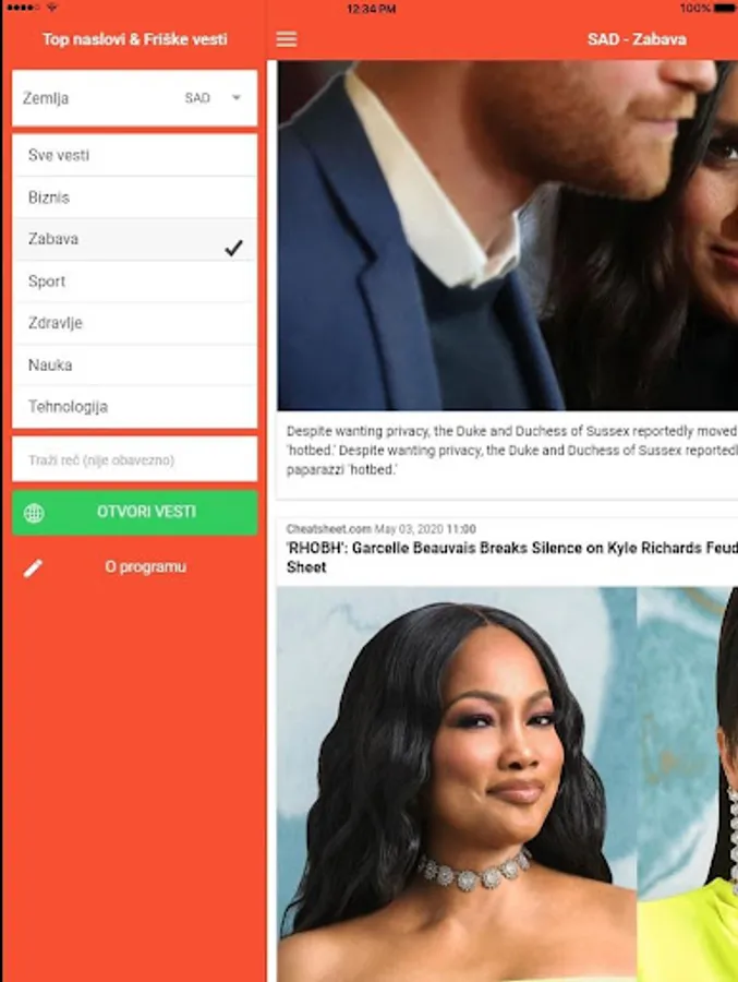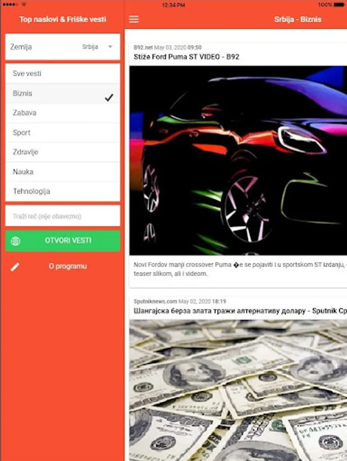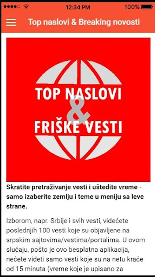 By choice, e.g. Serbia and all news, you will see the last 100 top Serbian news published and exchanged with the world by Serbian websites / portals / newspaper publishers. As this is a free application, you will not only see news that is less than 15 minutes online (the time subscribed for news release is given in relation to Greenwich, one hour less than Serbian time).