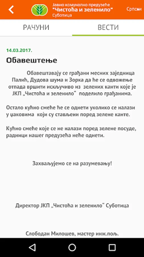 KP "Cleanliness and green" was founded in 1948, and in its present form in 1990 and operates as a commercial entity founded by the City of Subotica to provide public services of hygiene city and greenery and the collection and disposal of waste. Over time, these assignments are added to concerns about stray dogs (shelter), and the collection and primary sorting of recyclable waste.