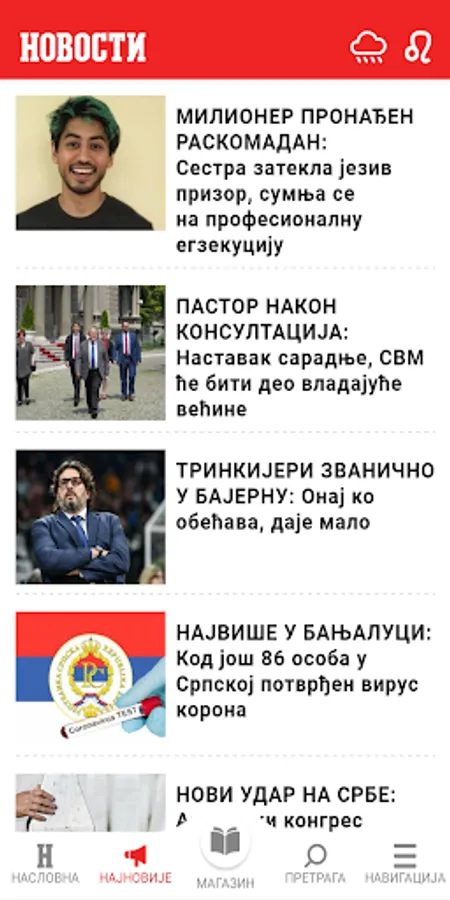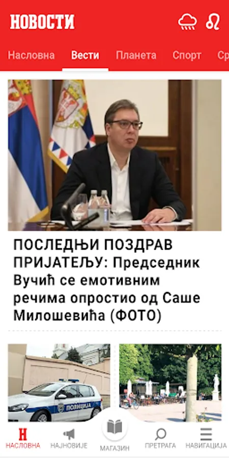 Čitajte najnovije vesti, tekstove naših novinara i dopisnika, gledajte foto galerije i zanimljive video zapise, a tu je i horoskop, vremenska prognoza, kursna lista koja ima ugrađen kalkulator valuta...