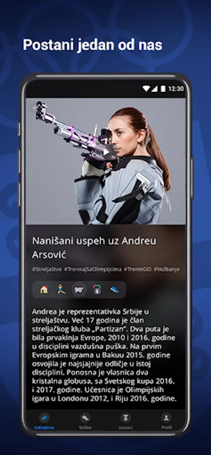 The mobile application TreninGO aims to motivate users to be active, to exercise regularly and live a healthy lifestyle. To find the best exercise location, users can search more than 120 running tracks and outdoor gyms throughout Serbia. According to the personal fitness level, they can choose several months of training and exercises suitable for indoor and outdoor space. Training with Olympians and sports challenges enable users to learn from champions, but also to compete in running and contribute to socially useful actions through their participation. The app helps users improve their daily habits, plan workouts and achieve personal fitness goals.