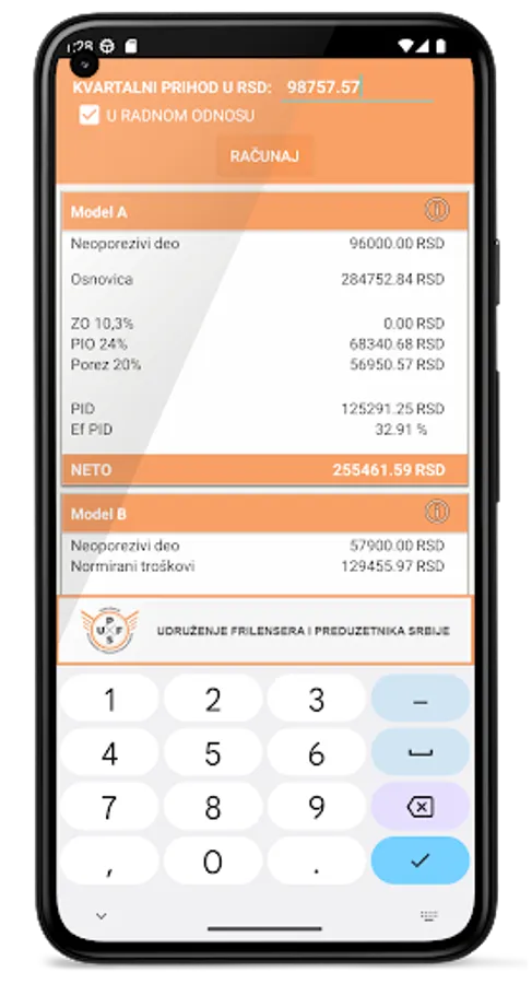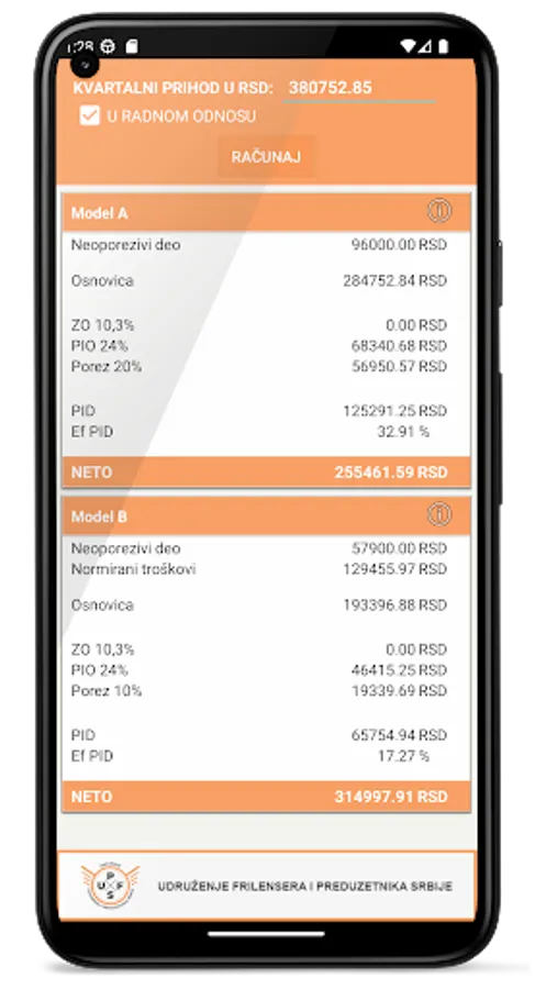 The calculator calculates tax according to both models that freelancers have a choice of.