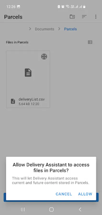 It is recommended that you place the "deliveryList.csv" file in the folder you created on the device for this purpose only, as the application will store the signature images in the same folder in addition to adding the necessary data to the "deliveryList.csv" file. For the folder where the "deliveryList.csv" file is located, before using the application, you must allow the application to use that folder and all content in it.
