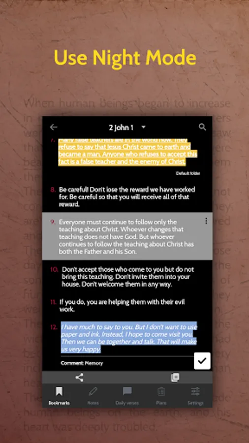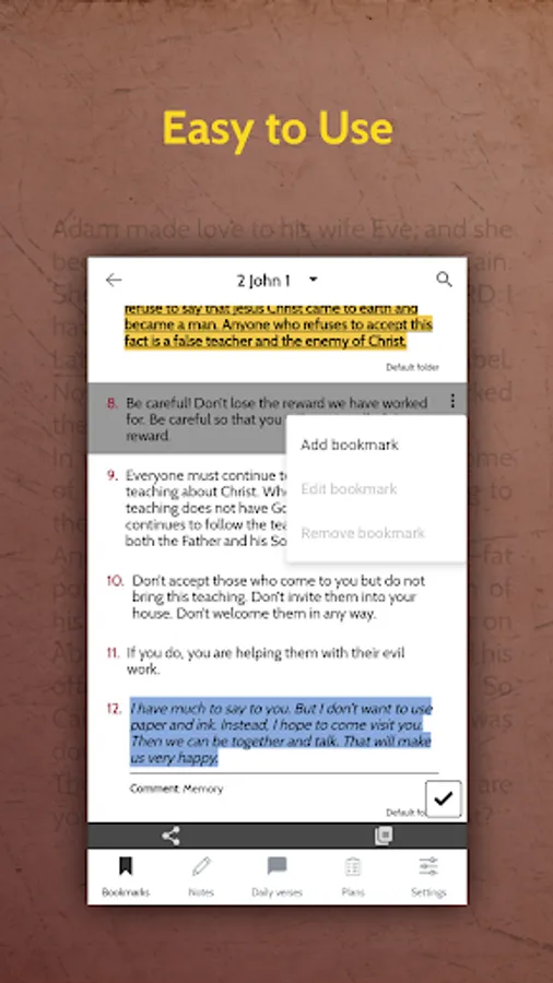 The following parameters stand out in favour of download our app: offline reading in English, adding handy bookmarks, daily verses with notifications, convenient and free study plans with customisable notifications feature, choice of theme and font size and much more...