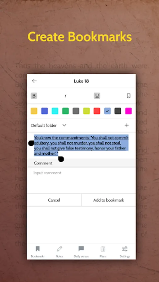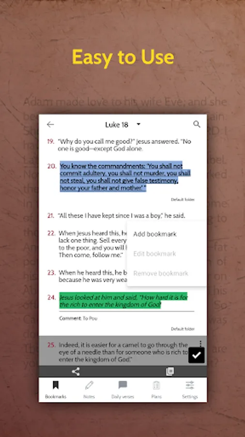 The following parameters stand out in favour of download our app: offline reading, adding handy bookmarks, daily verses with notifications, convenient and free study plans with customisable notifications feature, choice of theme and font size and much more...