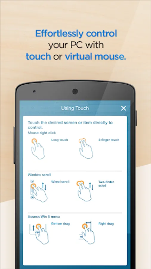 - Ease of Use: Assume control over a remote mouse and keyboard from mobile devices; Multi Touch, Scroll and Zoom are all supported.