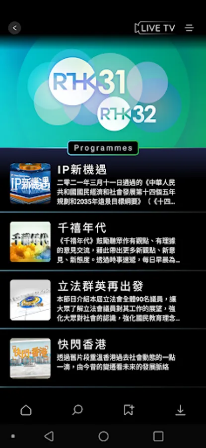 2) VoD and download: "RTHK TV" offers a video-on-demand (VoD) feature that allows you to watch our RTHK TV 31 and TV 32 programmes any time you like. You may also use the download function to pre-load our programmes to 'My Downloads' in the app for subsequent watching.